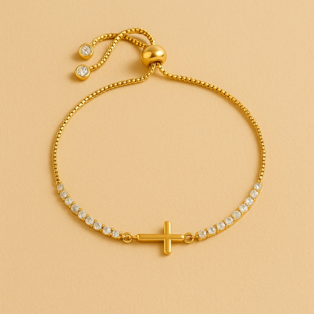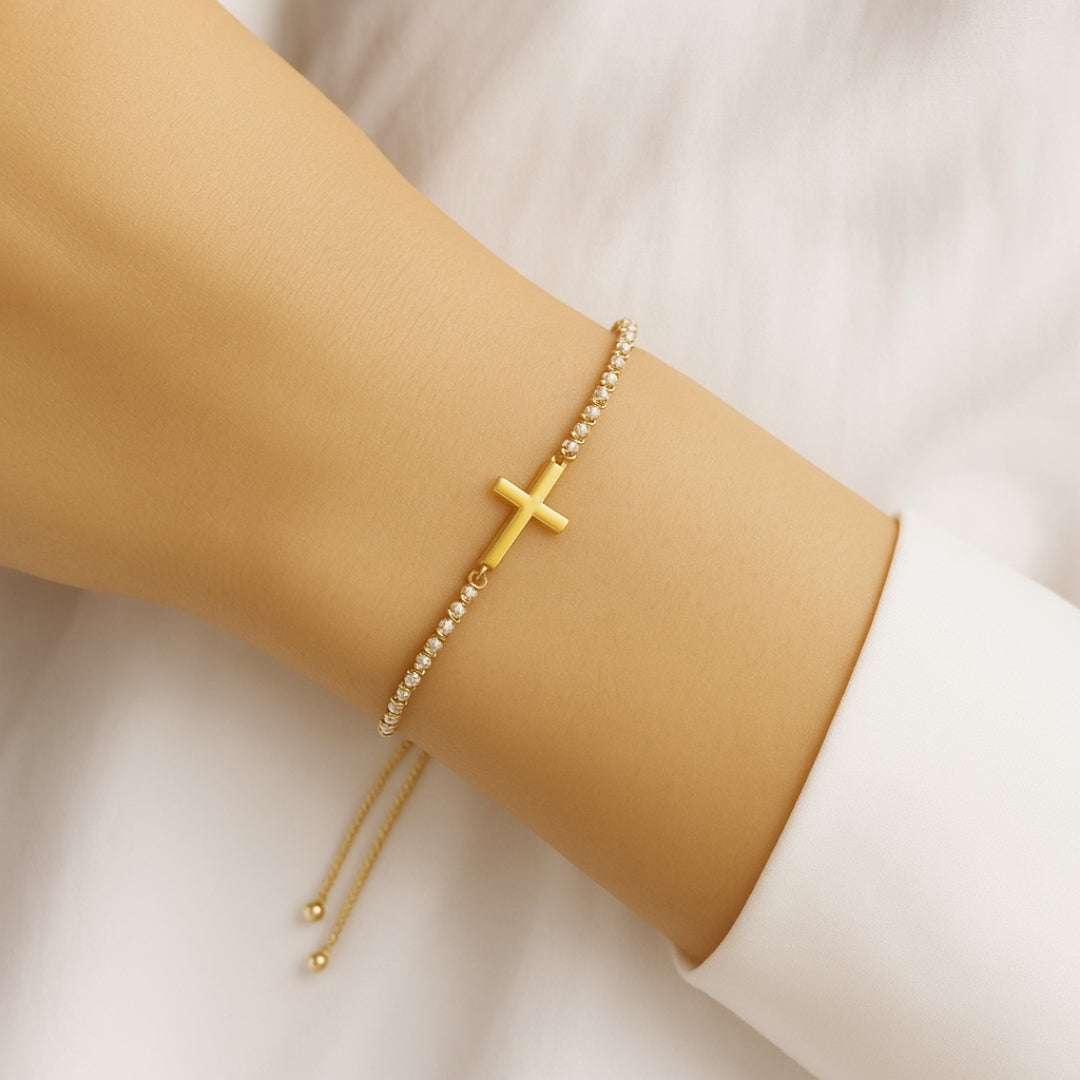 A minimalist cross bar rests flush against the wrist, catching light at every turn. Slide clasp ensures one-handed fastening; 18 k gold over 316L steel. Send it as a blessing to someone starting a new chapter.